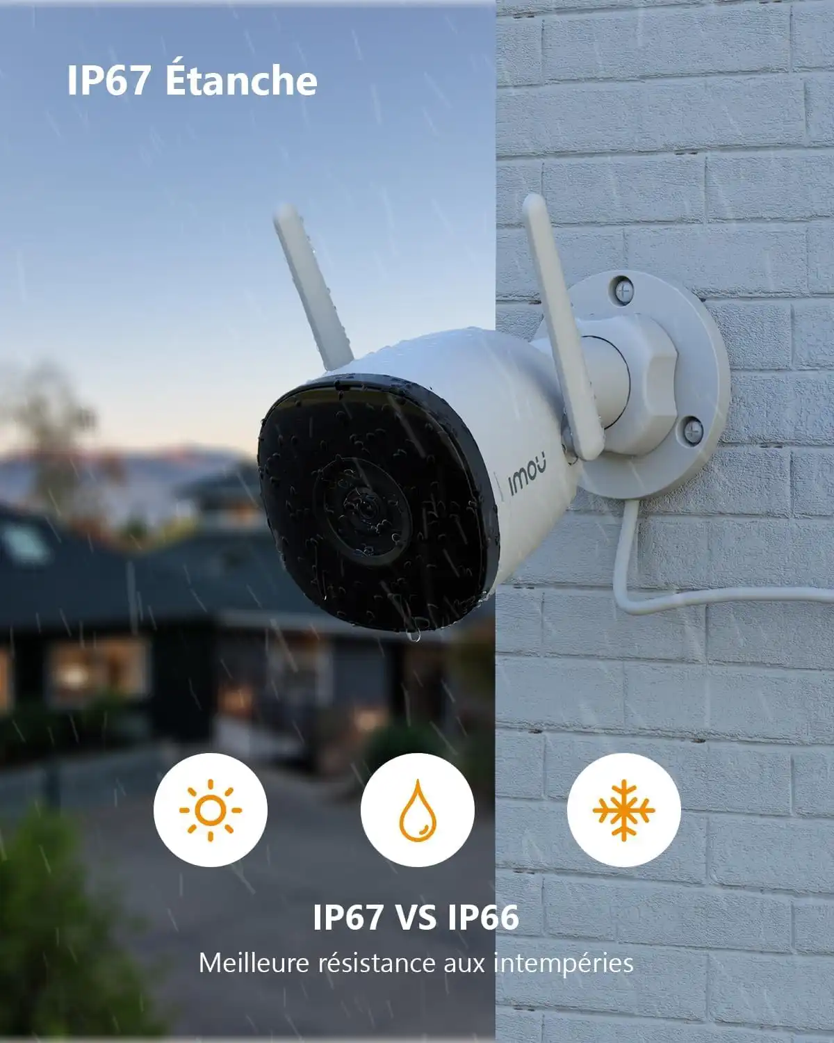 Specification Camera 1/2.8”3Megapixel Progressive CMOS 3MP(2304×1296) Night Vision: 30m(98ft) 2.8mm/3.6mm Fixed Lens Field of View: 2.8mm: 98°(H), 54°(V), 121°(D) 3.6mm: 82°(H), 44°(V), 104°(D) Network 1 x 100Mbps Ethernet Port Wi-Fi:IEEE802.11b/g/n/ax, Dual Antenna Imou App: iOS, Android ONVIF Video & Audio Video Compression : H.265/H.264 Up to 25/30 fps Frame Rate 8 x Digital Zoom Built-in Mic Auxiliary Interface Micro SD Card Slot (up to 512GB) Reset Button Notice Management Motion Detection Configurable Region Human Detection Configurable Voice General DC 12V0.5A Power Supply Power Consumption:<6 W Material: Plastic+metal Working Environment:-30°C~+60°C, Less Than 95%RH Dimensions: 165× 90 × 73mm (6.5 × 3.6 × 2.9inch) Weight: 280 g (0.62 lb) CE,UKCA IP67