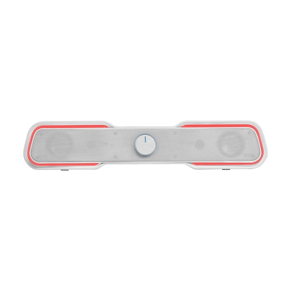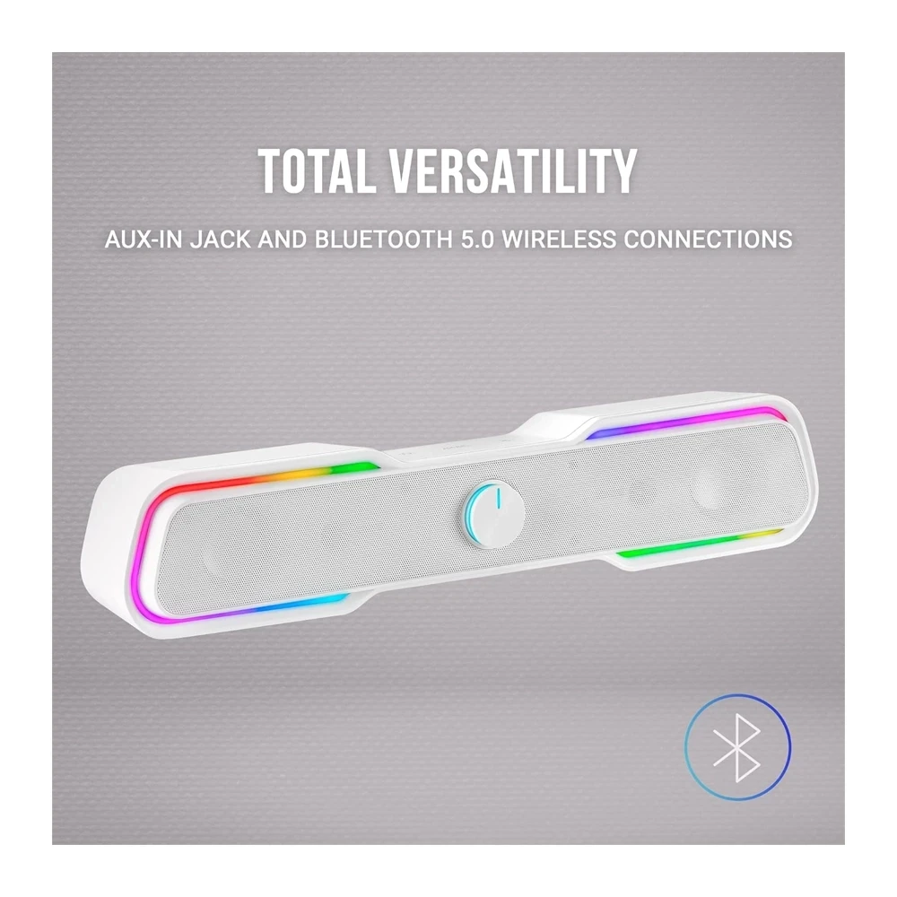 White RGB soundbar with 10W output, Bluetooth 5.0, and dynamic lighting effects. USB powered.