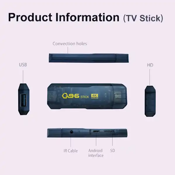 Transform any screen into a smart TV with the G96 TV Stick — featuring Android 12.1, Wi-Fi connectivity, and 4K video support for seamless streaming in stunning quality.