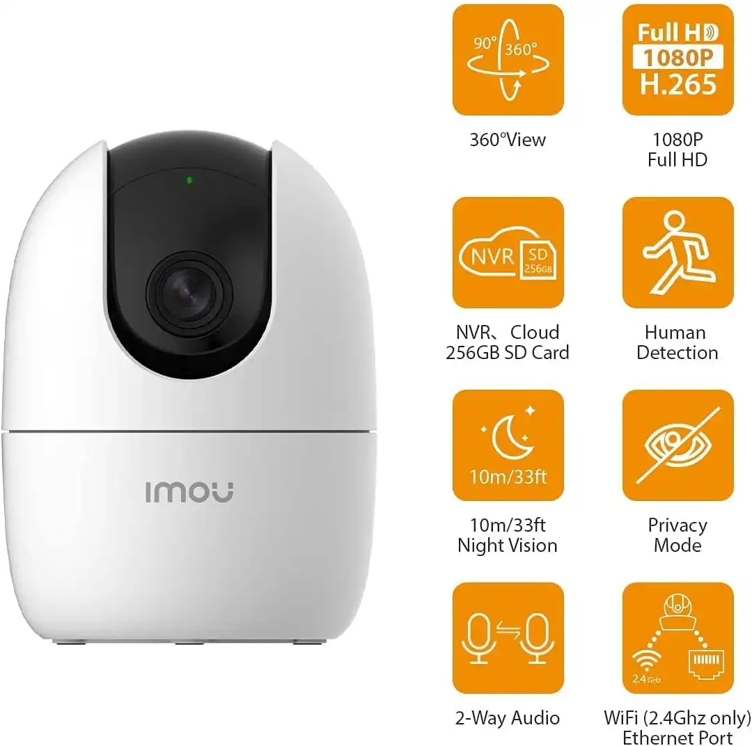 Specifications Camera 1/2.8” Progressive CMOS 3MP (2304 x 1296) Night Vision: 10m(33ft) Distance 3.6mm Fixed Lens Field of View : 83°(H), 46°(V), 100°(D) 355°Pan & -5~80°Tilt Network Wi-Fi:IEEE802.11b/g/n/ax,WiFi 6,50m Open Field Imou App: iOS, Android onvif Video & Audio Video Compression : H.265/H.264 Up to 25/30fps Frame Rate 8x Digital Zoom Two-way Audio Auxiliary Interface Micro SD Card Slot (up to 512GB) Built-in Mic & Speaker Reset Button Notice Management Motion Detection Human Detection Configurable Region Abnormal Sound Alarm