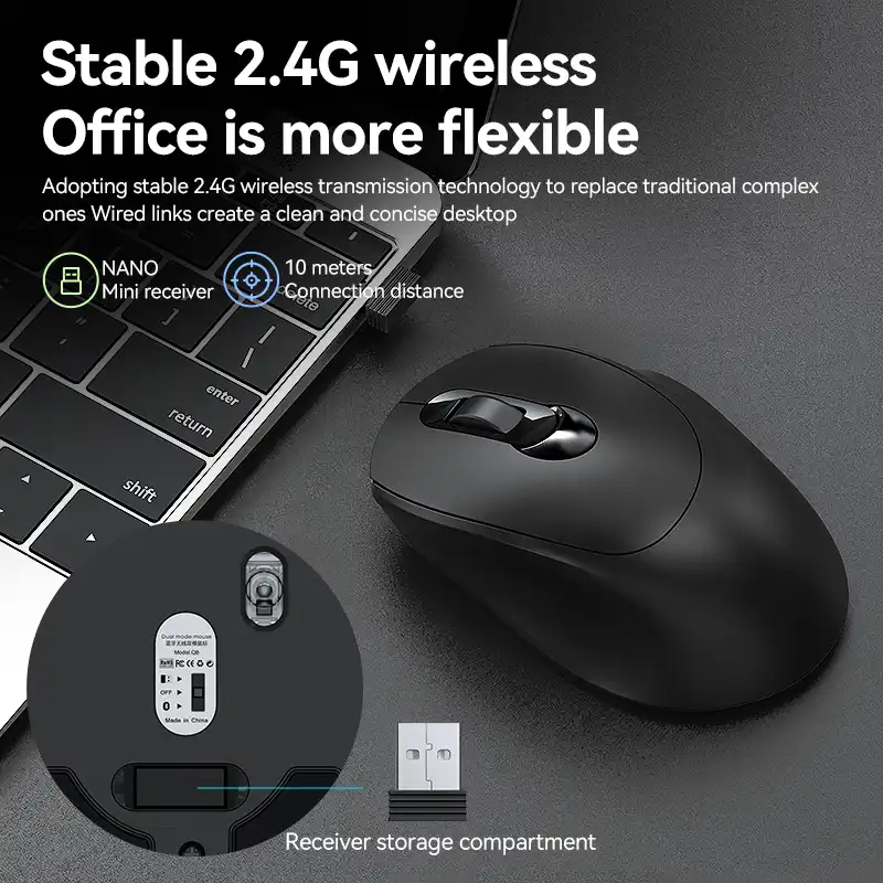 Featuring silent click technology, the Q8 mouse reduces noise, making it ideal for offices, classrooms, and shared workspaces. Its USB rechargeable battery saves money and reduces waste by eliminating disposable batteries. With 6 functional buttons and an ergonomic design, it offers comfort, efficiency, and productivity throughout the day.