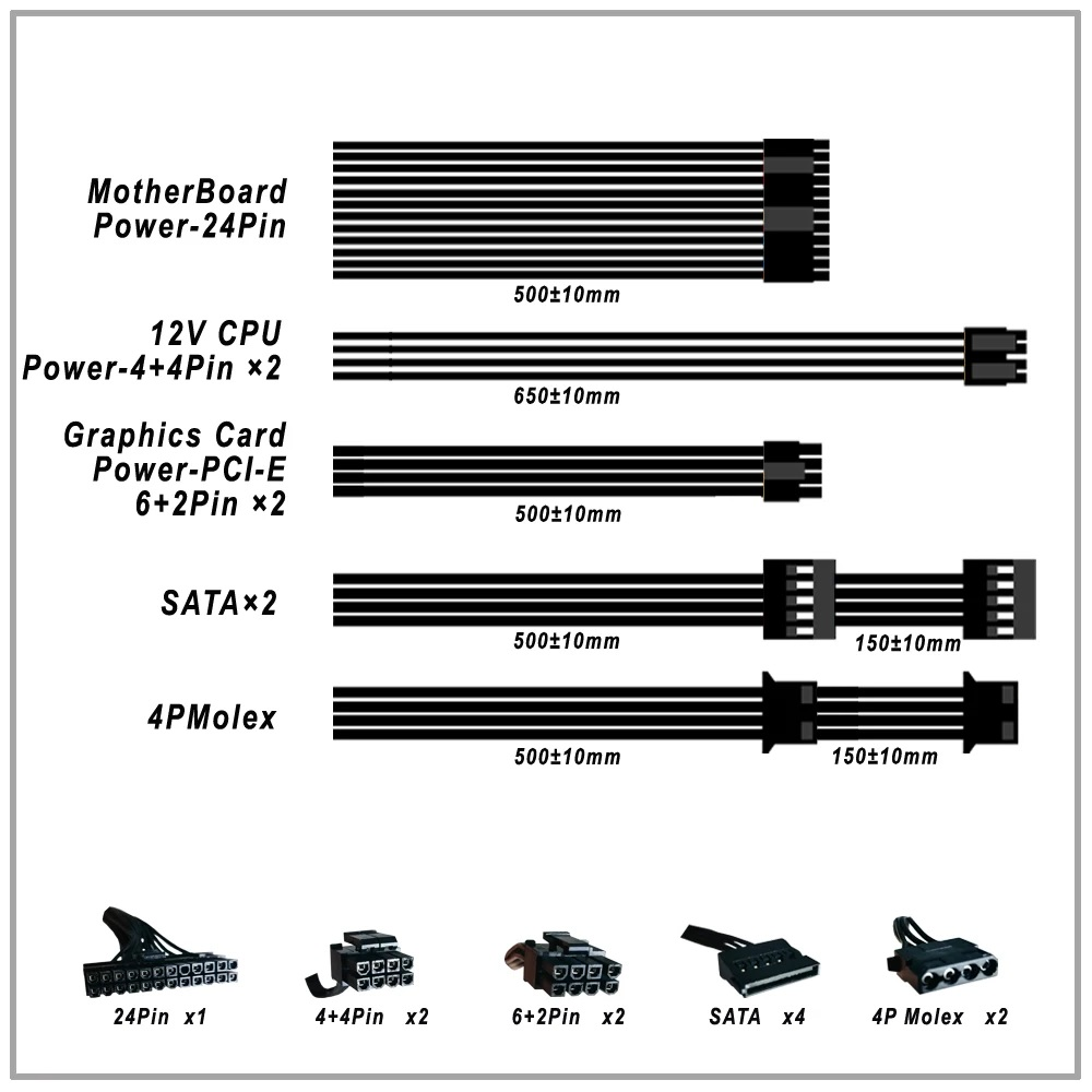 Key Features Wattage: 600W Max Power Form Factor: ATX Modularity: Non-Modular Cooling: 100mm (10cm) Hydraulic Bearing Fan with an RGB LED rim Fan Features: Silent operation Standard: Supports Intel ATX 12V 2.31 Version Safety Protections: Includes OVP (Over Voltage Protection), UVP (Under Voltage Protection), OCP (Over Current Protection), OLP (Over Load Protection), SCP (Short Circuit Protection), and Lightning Protection. Included Components 1 x 24-Pin ATX Cable (400mm) 1 x 8-Pin CPU Cable (450mm) 1 x 8-Pin PCI-E Cable (550mm) 1 x SATA Cable (450mm + 120mm)